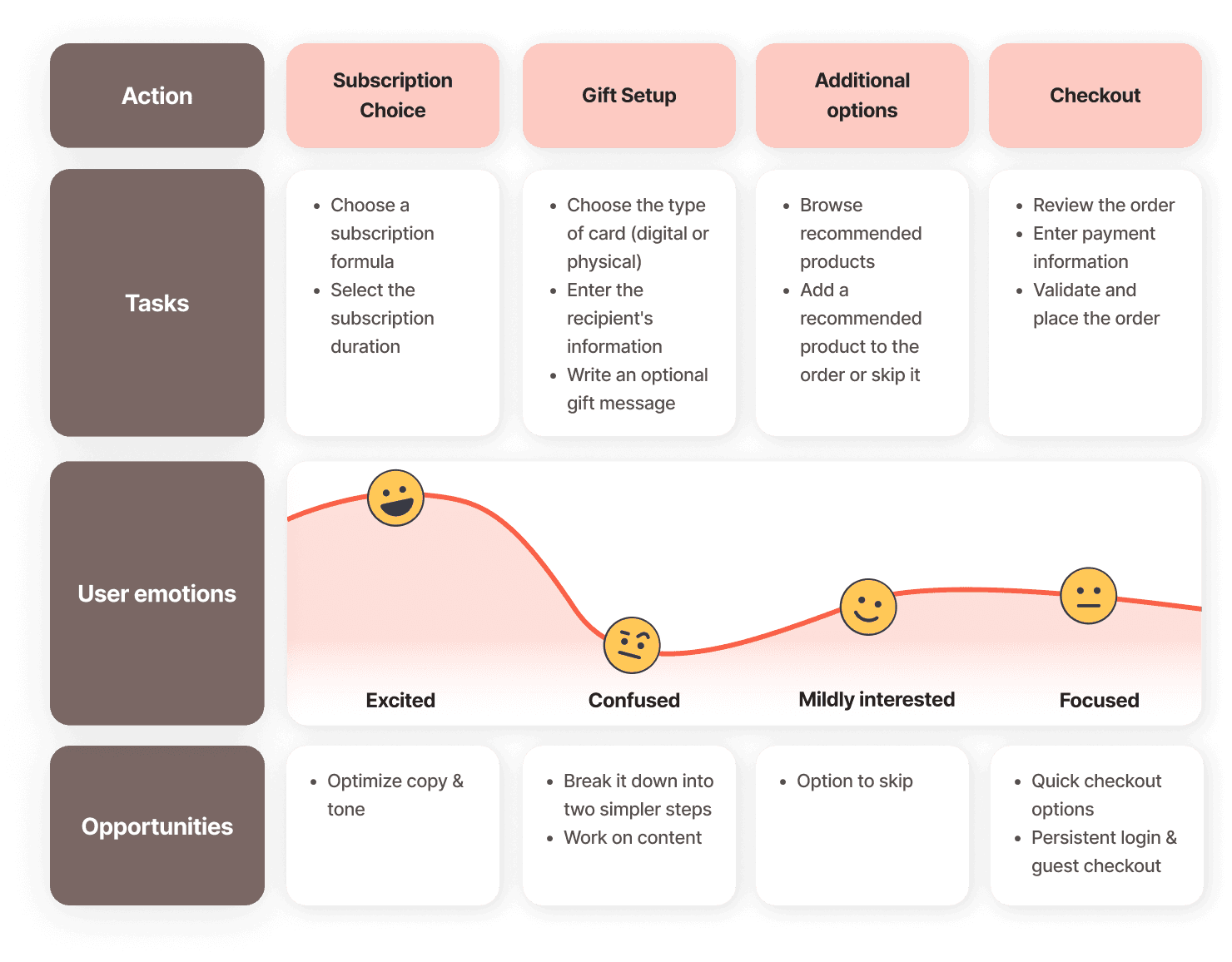 I used data and user feedback to create a journey map, outlining each step to visualize points of friction and identify opportunities for meaningful improvements.